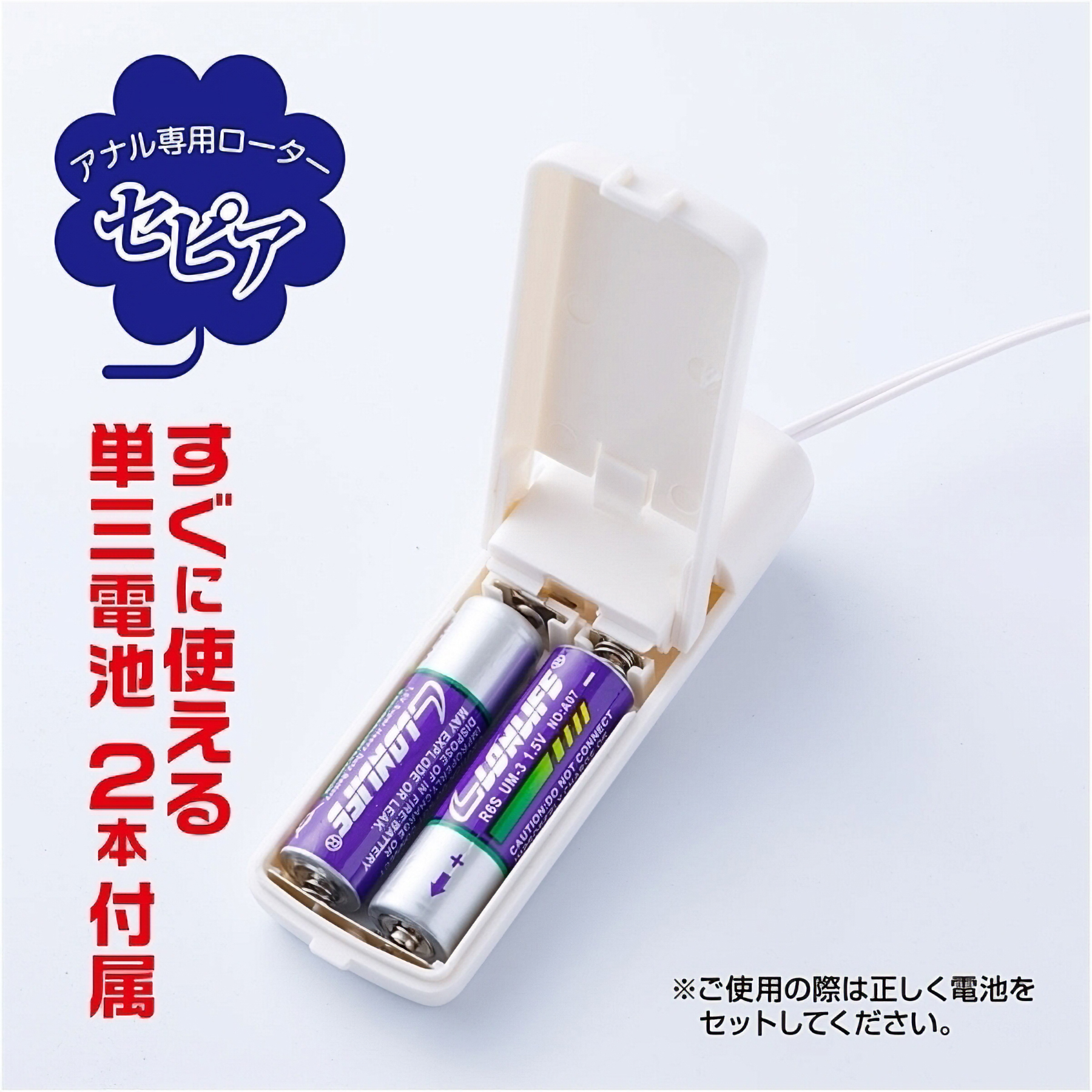 | 仕様 | パッケージ:10.5×5.4×3.1cm 本体:コントローラー10.2×3.5×2.4cm・ローター3.3×1.4cm・コード長70cm 重量:40g 電池:単三電池×2本使用 |
